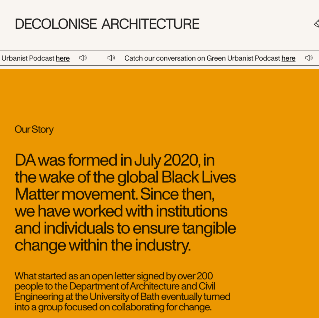 DA was formed in July 2020, in the wake of the global Black Lives Matter movement. Since then, we have worked with institutions and individuals to ensure tangible change within the industry. What started as an open letter signed by over 200 people to the Department of Architecture and Civil Engineering at the University of Bath eventually turned into a group focused on collaborating for change. In 2022, we registered as a Non Profit Organisation and are continuing to imagine and propose new methods of dialogue, delivery and democratising access to the built environment.